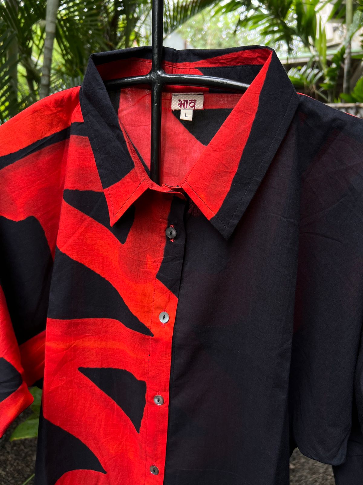 Prakriti collection celebrates nature-inspired wearable art, where every print reflects the organic rhythm of the earth. The women shirt is digitally printed on cotton light and breathable material Chinese collor shirt with puff sleeves and till elbow The hand embroidery on collor ,...